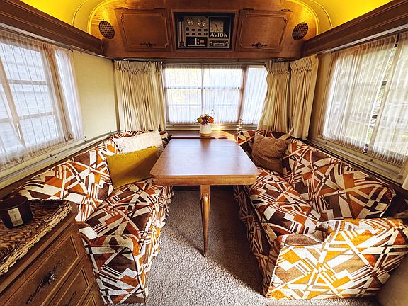 Inside, youll find about 220 sq. ft. of thoughtfully designed and preserved space with a relaxed 1970s boho vibe. The Avion, for this listing, is intended for one person but includes two twin beds with storage both overhead and underneath. If preferred, the beds can be converted into a queen before arrival (note: this setup requires climbing over the bed to reach the bathroom). The dining table folds down to create a lounge-style living area with two couches, perfect for reading, journaling, or streaming from your own device with fast WiFi. The kitchen & bathroom are fully stocked, and the bathroom offers a full shower with plenty of space and light.