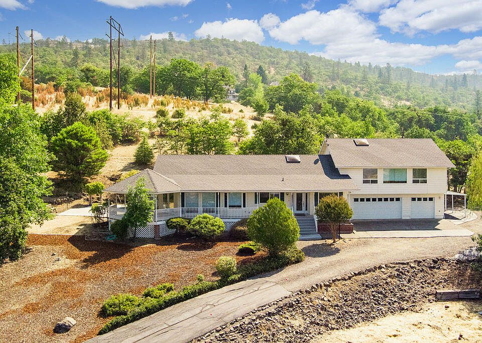 Breathtaking views of the Valley & Mts. Close to shopping, restaurants and schools on 9.77 Acres w/natural landscaping, detached garage/shop, 3 car garage w/workshop area, storage & a toilet w/sink. 3 bedrooms, 1 primary(main level) & 2 en-suites (upper level), 3244 SQ FT. Large covered front deck w/views of the valley & wraps around to a patio area. Stone entry, walnut hardwood floors in living room w/vaulted wood ceilings, formal dining area that w/built in buffet w/wine refrige that opens to kitchen w/lg island, black appliances, granite counters, 5 burner propane cook top that opens to eating area w/window seat & great room w/fireplace & new carpet, lg windows & slider to deck. Primary suite w/French doors to a sunroom w/new tile floors, bath w/tile floors, lg soaking tub w/marble surround & walk in closet. Lg laundry rm w/storage & sink. Upstairs has a large great rm w/lots of windows to take in the views & 2 en-suites. New interior paint & carpet.
