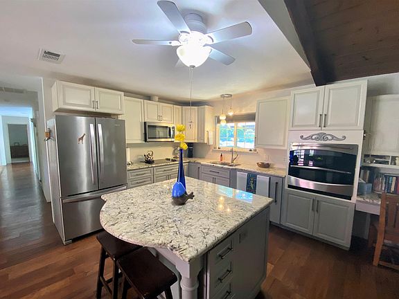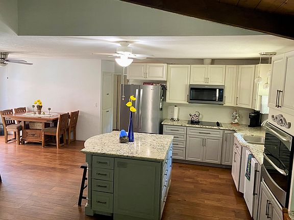 - Beamed Ceilings, Ceiling Fan(s), Kitchen Island, Kitchen Open to Family Room, Living Room Deck Attached, Open Floorplan, Remodeled, Stone Counters, Storage, Vaulted Ceiling(s)