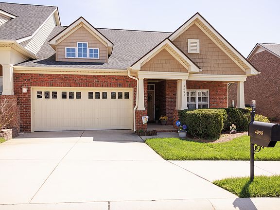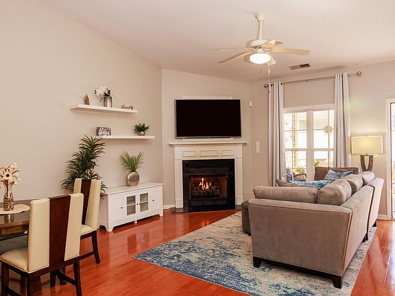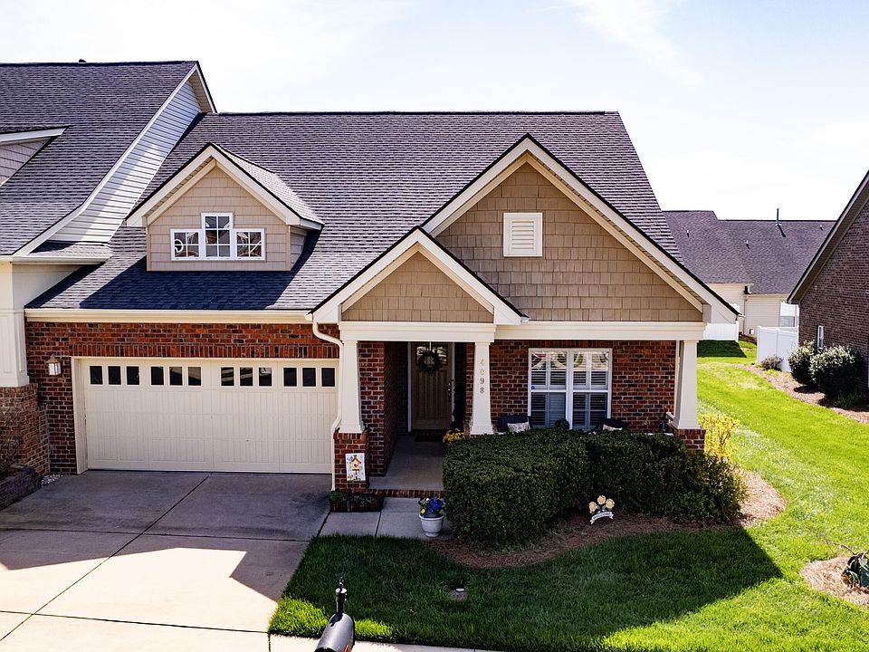 Beautiful 3 bed/2 full bath, single-story end unit brick townhome in Glenmoor Townhomes, located in the highly sought after Mackintosh on the Lake community! This spacious open floor plan creates an inviting ambiance, adorned with vaulted ceilings, cozy gas log fireplace, and beautiful hardwood floors. Kitchen is equipped with stainless steel appliances, granite countertops and breakfast bar, pantry. Master bedroom provides a private retreat, featuring a large walk-in closet, spa like en-suite bathroom with garden tub/shower, dual vanities and windows that allow generous natural sunlight. Outdoor space offers a lovely covered front porch with space for rocking chairs; nice screened-in back porch with storage room, charming courtyard, garden area, custom patio, surrounded by a privacy fence. Ample parking with attached 2 car garage and 2 car driveway; generous storage in attic above garage. This exquisite home is perfect for low-maintenance living. Enjoy the serene and upscale community; resort-like amenities include clubhouse, amphitheater with fire pit, swimming pools, fitness center, tennis/pickle ball/volleyball/basketball courts, playgrounds, and walking/biking trails. Conveniently located to shopping, restaurants, and the interstate.