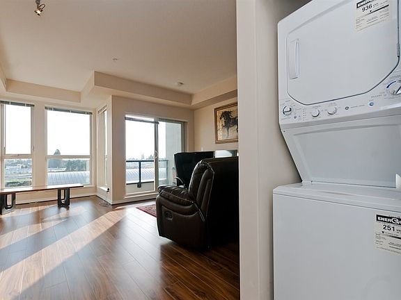 Bonus storage lockers! Turn-key ready investment property with excellent tenant ($1350/mth) or a great first home. This 6th floor, east facing unit has a modern styling with minimalist design. A new A/C and heating unit has been installed ($4500) this year, as the original developer installed units were failing in many units. Conveniently located only 15 minutes walk to Aberdeen Skytrain Station and Kwantlen University. Showings can be scheduled with 24 hours notice. Parking and 2 storage lockers