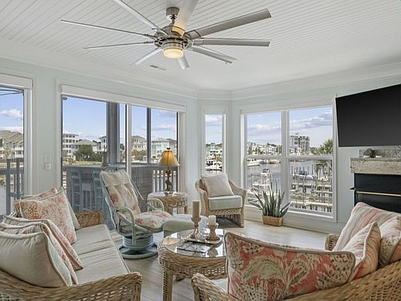 A gorgeous canal front condo in Carolina Beach with stunning views from the expansive screened in porch and living room/kitchen. This three-bedroom condo also comes with 3 tandem parking spaces under the building and a private 40-foot boat slip on the canal so you are covered for your cars and boat. Only one block from the Atlantic Ocean /Beach and two blocks from the Carolina Beach Boardwalk. CONDO: Second Level- 3 Bedrooms / 2 Bathrooms with its own private elevator for your convenience. There are two entrances, front and back, and two large porches for sunning and entertaining. You enter into a front foyer that has doors for the 2 bedrooms. The arched hallway (has a coat closet and large guest bathroom/ fun jacuzzi tub) ends in the great room. (Approximately 1500 sq ft.) Kitchen: The functional designed kitchen is a cook's delight with every detail considered including a double electric oven with a gas range, pot filler, and an auto drawer microwave. The white raised panels custom cabinets were designed with lots of drawers for easy storage. The long custom knobs (a designer’s delight) make all cabinets a snap to open. The kitchen is finished with white granite counters and farm-style stainless sink. All appliances are stainless steel including dishwasher and refrigerator. Great Room: This large room includes a granite dining bar, dining area, fireplace and living room area. All open with bead-board ceilings and two Big Boys Fans/Lights controlled by remote and/or wall switches. The open concept here refers to all the windows (a wall and a half) open to the water view on the canal. Yes, you can watch boat traffic from your living room sofa or back porch. Master Suite: The master has two entrances, from the great room or from the back porch which means you have a small view of the water. It is designed for maximum storage with custom designed built-in wall unit and 2 custom walk-in closets. The large master bath has a walk-in shower, 2 vanities, white granite counters and a half wall of linen closets with 8 doors.