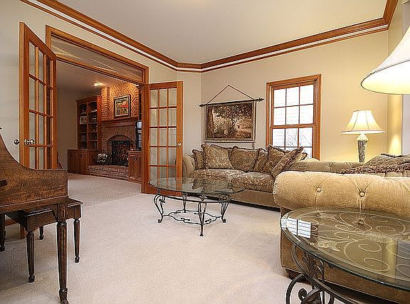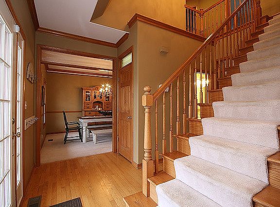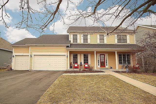 Charming Colonial with inviting front porch ! Enter into the split foyer with hardwood floors and wood cased openings with transoms above leading to the living and dining rooms! Living room with multi-piece crown molding and French doors with transom above leading to family room. The formal dining room has multi-piece crown molding and chair rail. The large eat-in kitchen has 42" Brakur cabinetry, granite countertops and Stainless Steel appliances! The kitchen eating space has a slider leading out to a patio overlooking the beautifully landscaped yard! Family room with floor to ceiling fireplace framed by built-ins! The first floor den with closet could be a guest room. The oversized master suite with tray ceiling boasts 2 walk-in closets and private luxury bath with dual vanity, whirlpool tub and big walk-in shower with glass surround. Three more large bedrooms (one with 2 skylights!) and full hall bath complete the 2nd floor. Full finished basement with big rec room, adorable play room under the stairs and 5th bedroom and full bath! Take the living outdoors onto your patio and professionally landscaped yard! Come and enjoy Fox Mill's top rated elementary school, club house, pool, 5 miles of bike/walking paths and 243 acres of open space... Minutes from Metra Train Station! What more could you truly want...