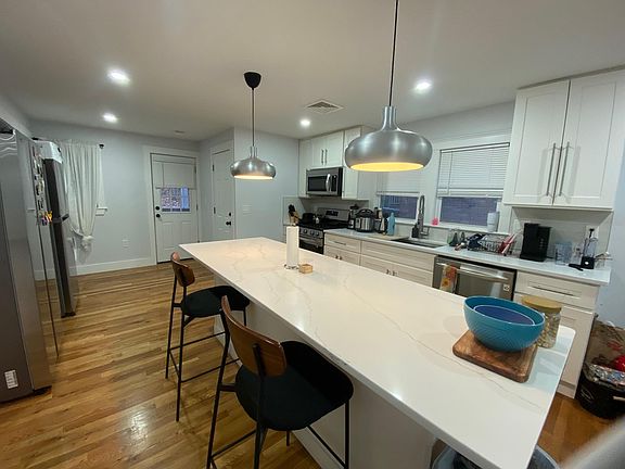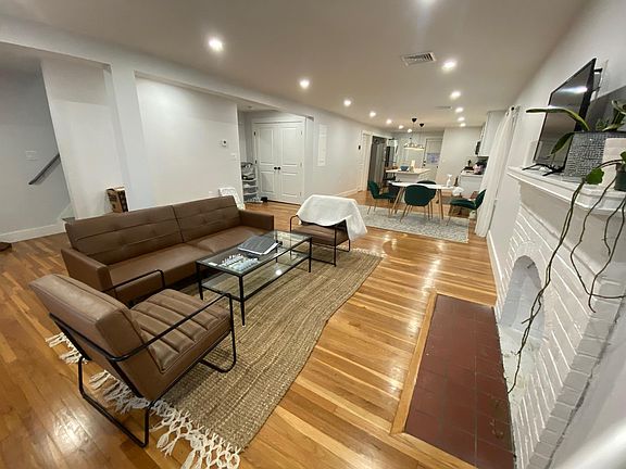 Beautifully gut-renovated property offers 5 spacious bedrooms and 3 modern bathrooms, and office area, perfect for anyone looking for spacious luxury living. First Floor consists of 3 beds 2 baths, living room, dining room and deck. Second floor consists of 2 beds 1 bath and another living area. Key Features: 5 Bedrooms: Ample space for everyone, each room featuring large windows and/or skyline and generous closet space. 3 Modern Bathrooms: Newly renovated with contemporary fixtures and finishes, ensuring a spa-like experience. One bedroom is ensuite with walk in closet.. Master bath hasdouble sinks with quartz countertops and ample storage space and a spacious walk-in shower with with glass doors. Fully Renovated Kitchen: Equipped with brand-new stainless steel appliances, 2 fridges, quartz countertops, and plenty of cabinet space. Open Living and Dining Areas with Huge Island: Perfect for entertaining, with an open layout that enhances the spacious feel of the home. In-Unit Laundry: Convenient washer and dryer included. Kitchen lead to a private deck. Hardwood Floors: Elegant and easy to maintain, adding to the home's modern aesthetic. Central Heating and Cooling: Stay comfortable year-round with a state-of-the-art HVAC system. Proximity to Train Station: Just a short walk to the train station, making your commute a breeze. Common Area are furnished with modern furniture and kitchen is supplied with all kitchenware. Parking available. Common yard. 14 month lease