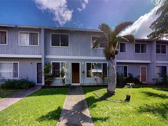 Fresh & inviting! Thrive in desirable four bedrooms for office, hobby, kids, or guests. Enter thru spacious, gated, partially roofed courtyard with half bath that puts outdoor living a step away from your living room and offers soft morning sunlight & afternoon shade giving private haven for your ohana. Welcoming cross breezes fill your home. Lots of storage throughout; full closets in each room, even attic space! Huge frig/freezer, security system, solar water panels, luxury vinyl floors, new carpet, plenty parking! Live where pets are loved & maint.fee is reasonable. Exhale amid the breathtaking Koolau Mountains, drive five min. to easily accessible, uncrowded beach rated one of the best on earth! This is Hawaii living. Check out 3D tour & photos. Nothing in this price range can compete