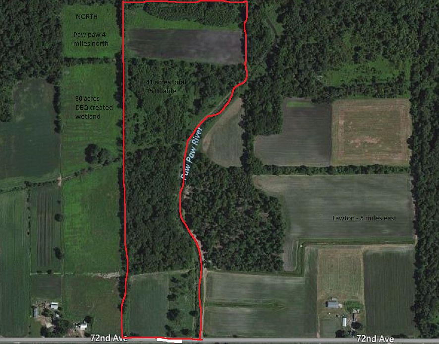 15+/- tillable and currently farmed 14+/- wooded 12+/- fields that havent been farmed since 93 1500+/- river frontage eastern prop line (south branch of Paw Paw River)