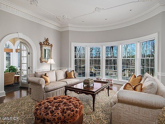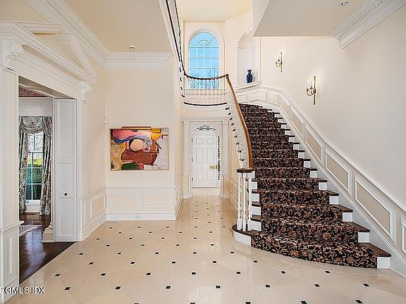 Enjoy dramatic views of Putnam Lake from this gated 8.35 private acres on a quiet Mid-Country cul-de-sac. Custom Georgian designed by Paul Marchese of handcrafted stone, copper and slate roofs, 125 feet of bluestone terraces, pool, gardens and level lawns. An architectural masterpiece with 12 foot ceilings, custom mill work, plaster moldings with spacious public rooms-formal living room, elegant dining room, paneled library and sunroom. Gourmet kitchen and breakfast room adjacent to family room. Walk out lower level with professional theater, mirrored gym, steam and sauna, wine cellar, billiards room and bar. Luxurious Primary Suite with two bathrooms, 2 dressing rooms, spacious bedroom and a sitting room. 5 additional ensuite bathrooms. Finished, walk up third floor. Elevator. Generator.