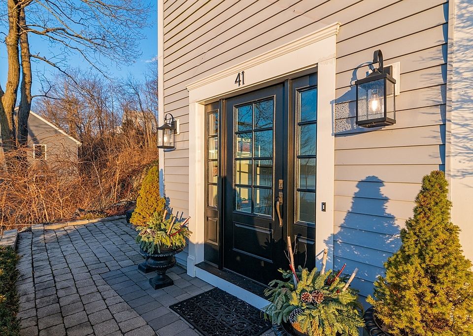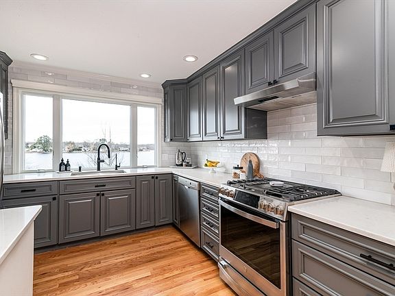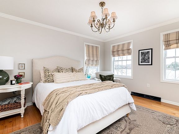 Stunning Contemporary Colonial! 1st floor features eat in kitchen/dining, walls of windows, fireplace living room, hardwood flooring, crown molding, beautiful half bath, loads of closets, 2nd floor boasts 3 beds, hardwood flooring, crown molding, full bath, main bath, jacuzzi tub and separate shower stall, laundry room. 3rd floor is great space with many uses. Space for home office, family area, or a home gym. Beautiful entry way with heated flooring, Central Air. Enjoy summer entertaining, or morning coffee on decks overlooking the water, awake to amazing sunrises and end day with a gorgeous sunset. Roof and Skylights new (2023); Central Air.