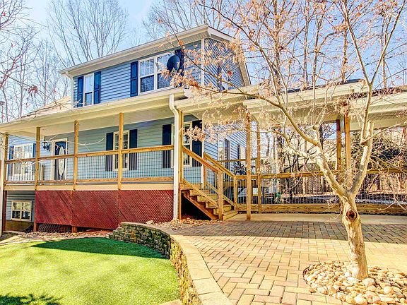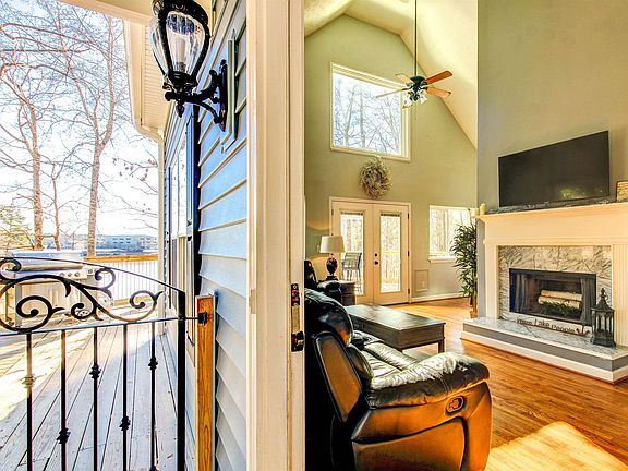 Lakefront home in a great location with area of Year Round Water! 156 feet of waterfront with floating dock. This home has 4 bedrooms/3 baths with Master suite on main level. Great room is stunning with cathedral ceiling, hardwood floors and fireplace. Hardwood floors continue into the kitchen with beautiful wood cabinetry with granite countertops. The Master suite on the main floor has a private balcony to enjoy the beautiful landscape. A second full bath on the main level. The upper level has two guest bedrooms and a full bath. The terrace level has a Flex room that can be used for sleeping those extra guests. A large rec room with wet bar and big screen TV makes entertaining easy. Outdoor space includes spacious sitting area, hot tub for 6 and a fire pit. Storage barn for all your water toys! Community boat ramp and located close to the marina. Conveniently located to shopping and restaurants. Paved road. Great rental history/investment potential!