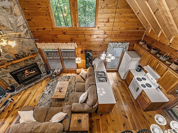 An amazing true log cabin with long range year around mountain views! Comes totally furnished and is an established rental with $9,000.00 gross resulting in $7600.00 net of rentals already booked for Oct, Nov, and Dec! And more to come in that time for sure! These rentals can transfer to the Buyer!!! 2 Bedrooms, 2 full bathrooms with Open floor plan. Woodburning Fireplace in Living room , and bubbling hot tub!. Located in the desirable Cherry Lake community with 9 stocked lakes & the Benton Mckaye trail running through the community for easy access hiking. Close to shopping in Ellijay and Blue Ridge, hiking, boating on Lake Blue Ridge, kayaking, tubing on Toccoa River. Come sit on the porch and enjoy the tranquility & the gorgeous full time views of the layered mountains.