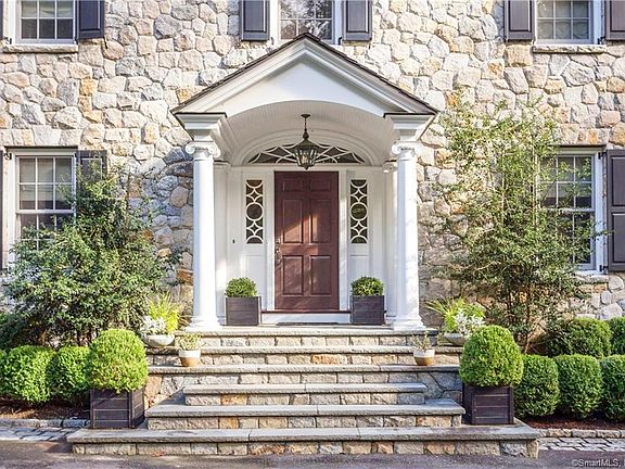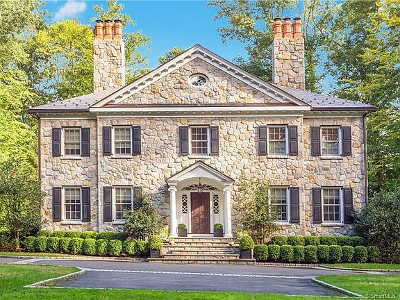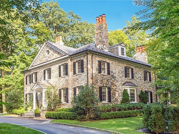 Elegant custom stone Georgian home secluded at end of cul-de-sac off Round Hill Road. Extraordinary craftsmanship and detail throughout the structure; hand-chiseled stone exterior, imported marble, extensive raised paneling, 10 ft ceilings, mahogany library, Christopher Peacock kitchen and exceptional redwood wine cellar. The interior space extends to 8,900 sq. ft. on 4 levels with five en-suite bedrooms and Waterworks custom baths. The spacious master suite with balcony includes two dressing rooms with luxury bathroom. The finished lower level features a media room, fitness room, playroom, full bath and wine cellar. Relax in the beautiful outdoor family room terrace with fireplace. An outstanding home in a peaceful private setting.