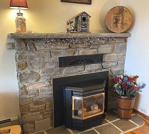 - Fireplace features: Stone, Mantel(s), Pellet Stove