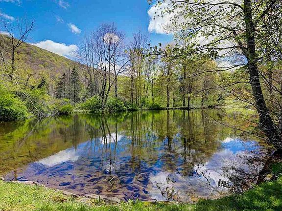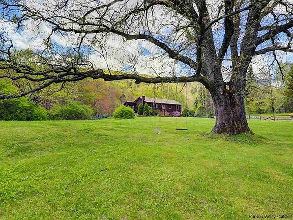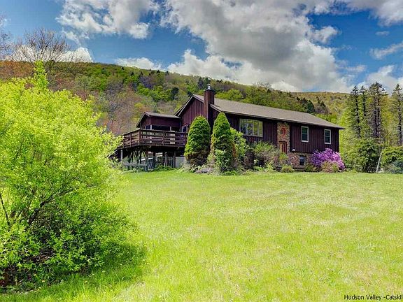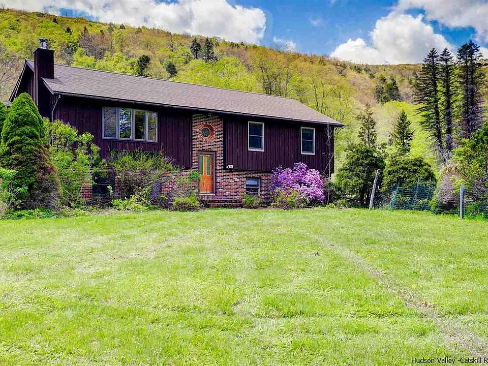 An easy drive up from the city to the road that traverses a hollow, crosses over a crystalline stream, and plunks you smack-dab in the midst of a stunning setting. Wide-open magnificent Catskill Mountain views, replete with pond, surrounded by protected wild forest - the property is utterly enchanting. The magic of the bucolic environs both soothes and energizes. This Sweet Slice of Country Life makes for a delightful weekend getaway place, or a desirable full-time residence. Ready to be lived in as is, though a creative eye could have some fun with aesthetic enhancements. Screened-in porch, generous decking , numerous windows with painterly views all serve to bring the outdoors in. Back deck was recently constructed per specs to expand the footprint of the house, a breeze to either add that space or simply enjoy the fresh air. Energy-efficient at just under 2,000 square feet (1,921 total, 625 ground level). Top floor: open-space floor plan with kitchen open to vaulted-ceilinged great room, 2 bedrooms, 2 bathrooms. Ground floor: living room with expansive brick fireplace, 2 bedrooms ( or use one as an office), utility room with washer/dryer (could accommodate lavatory). 2-car garage for cars and/or projects & hobbies you don't yet know you'll enjoy. 3.2 acres on a quiet dead-end road. Gardens, with shed used as chicken coop. Level acreage makes it easy to navigate in all four glorious seasons. Perfect balance -- tucked away yet in convenient proximity to ski slopes, swimming holes, hiking trails, world-renowned fly-fishing, craft brewers & distillers, quaint farm stands, cultural imprints of art galleries, antiques, and hip urban-influenced lodges, restaurants, charcuterie, bakers and makers. This is the kind of place that turns weekenders into full-timers.