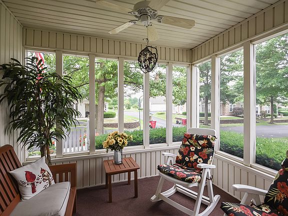 Welcome to country club style living in this beautiful, open and airy home in the very sought after and desired active adult community of Lionsgate. Meander down the professionally landscaped walkway and enter into the foyer that features gleaming hardwood flooring that flows throughout the living and dining rooms and into the kitchen. Immediately off the foyer, double doors leads you into a beautiful vaulted ceilinged room, brightened by a huge double palladium window, that can be used as an office, den or even another bedroom. Enjoy cozy nights by the gas fireplace in the living room enhanced with vaulted ceilings and brightened by windows on either side of the fireplace. Enjoy your morning cup of coffee in your three season screened in room right off the living room. Cooking will be a delight in your open concept kitchen overlooking the dining and living rooms and equipped with lots of natural wood cabinetry, tons of countertop space for preparing your food and a double sink for ease of cleaning. A spacious, freshly painted and newly carpeted first floor master bedroom with vaulted ceilings and ceiling fan also has a large walk-in closet and a newly redone ensuite bath featuring his-n-hers separate vanities. The second bedroom on the first floor, also freshly painted with new carpet, has vaulted ceilings with a ceiling fan and also with its own full bath, is conveniently located on the other side of the living area for complete privacy. The laundry room is also located on the main level. Upstairs leads to a large finished loft/guest bedroom also featuring a full bathroom allowing convenience for a guest quarters or additional storage. Take advantage of the two-car garage with direct inside access to the home. All of this plus a new HVAC system in 2017 and all of the community amenities including a pool and clubhouse will want to make you call this home!