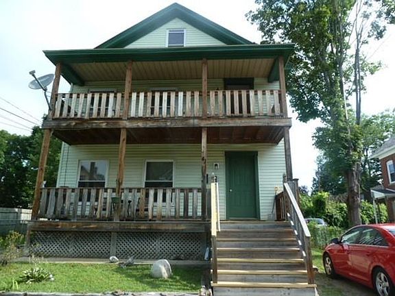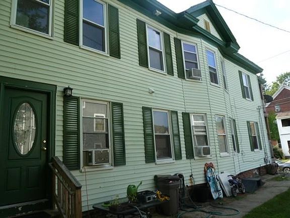 Solid & remodeled within the last 5 years 2 family up the hill yet close to down town, walk to the grocery store, restaurants, library, local theater. Each unit is metered sep. with upgraded electrical 100 amp CB, 3 bedrooms, 1 bath, kitchen, pantry, living room and dining room. Additional storage available for both units. Hallway with side second egress. Front porches on each, each unit is bright with lots of natural light. Natural gas for all utilities, sep. meters for each unit. Washer dryer hook ups in basement for both units. Nice level back yard for relaxing, playing or potentially gardening. Off street parking sep. for each unit. First fl has a cat, no pets second fl and no smoking in apartments. Very well maintained. Basement windows 5 years. Replacement windows throughout, roof new 5 years ago.