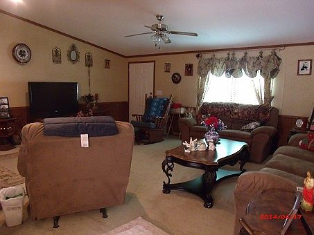 Newer manufactured home on 8 acres with a nice pond and large 44x32 workshop with water electric and septic service. Home features huge master suite with attached bath and walk-in closet and 2 other large bedrooms with large closets. Storage area is not an issue with this home. Living areas are open and bright, wood-burning fireplace in living room, huge kitchen/dining room with lots of windows and natural light, enclosed entry porch with french doors leading to master bedroom or breakfast room and large covered front porch. There is about 1 1/2 acres of cleared land and the rest is in mature trees.
