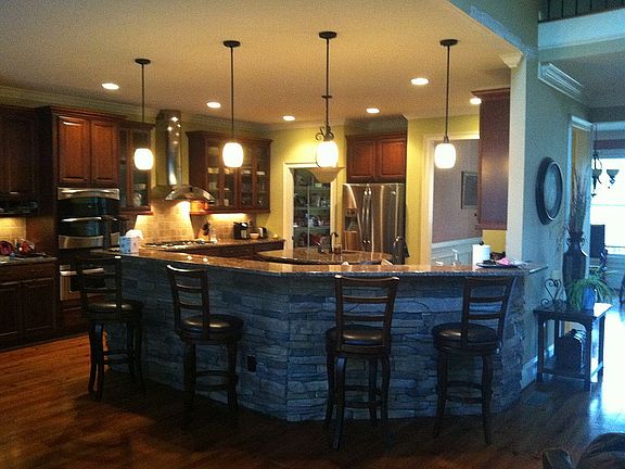 - RoomKitchenFeatures: Granite Counters, Kitchen Island, Pantry, Recessed Lighting, Eat-in Kitchen, Floors-Hardwood, Cabinets-Stained, Bar, Backsplash-Tiled, Prep Sink