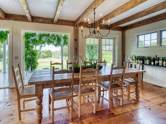 lush acres just blocks from Gibson Beach. A wraparound front porch welcomes you into light-filled living areas flowing among a double height living room with stone fireplace, dining area seating ten and eat-in chef's kitchen with peninsula seating and high end appliances. Multiple sets of French doors open to the porch overlooking rolling lawns and a gunite pool. Antique beams and wide plank wood floors add to the home's relaxed barn-like ambience. The spacious first floor primary suite has its own fireplace, adjacent office, and French doors which lead to the lush grounds. Three guest bedrooms and a full bath are upstairs. In the finished lower level find a media lounge, ping pong and bonus room plus full bath. Enjoy refreshing ocean breezes, nearby farmstands, and the timeless spirit of Sagaponack in this peaceful, private setting.