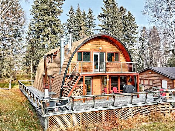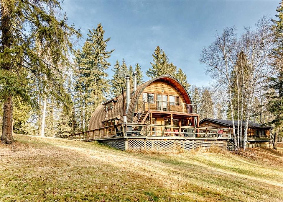 Just minutes west of Rocky, this charming arch-rib home is nestled among mature trees in a peaceful, park-like setting. Two levels of decking offer the perfect place to relax, unwind, and take in the beauty of the surrounding countryside. Inside, the main floor features a spacious kitchen that flows into the dining area and the cozy living room, complete with hardwood flooring and a wood-burning fireplace. A 3-piece bathroom, flex room, and laundry room add convenience to the main level. Upstairs, you’ll find four comfortable bedrooms and a 5-piece bath. The primary bedroom is generously sized and includes a private balcony overlooking the acreage—ideal for morning coffee or quiet evenings. The property also offers great utility with a double detached garage (31'5" x 23'7") and a well-sized shop with a wood stove (29'4" x 27'4"), perfect for projects, storage, or hobby space. A true country retreat—private, peaceful, and full of rustic charm.