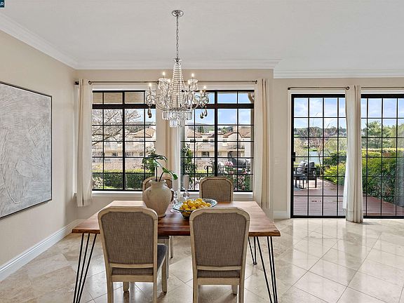 Discover luxury living at its finest! This stunning ground floor condo has breathtaking panoramic views of the Lake & Mt. Diablo from every room in the home. The former model home is loaded with upgrades, featuring custom crown molding & baseboards, new travertine floors & a grand Mahogany front door. The open floor plan showcases a gourmet kitchen w/ custom cabinetry, granite slab counters & high-end stainless appliances. The kitchen opens to the dining room highlighted by a sparkling chandelier & the large family room w/ a cozy gas fireplace. A spacious primary bedroom suite offers dual sinks & a walk-in closet w/ custom built-ins. The additional bedroom w/ a closet can also be used as an office. And the 20x16 ft deck & large garden area is perfect for entertaining & soaking in the picturesque views. Bonus features include a 2-car garage w/ interior access from the laundry room w/ a washer & dryer. This finished garage features custom cabinetry & ample storage in the attic. Enjoy Canyon Lake amenities like a security gate, pools, hot tubs, tennis/pickleball courts, community barbeques & scenic walkways. Conveniently located near award-winning schools, fine dining & diverse shopping options. Don't miss out on this exceptional home!