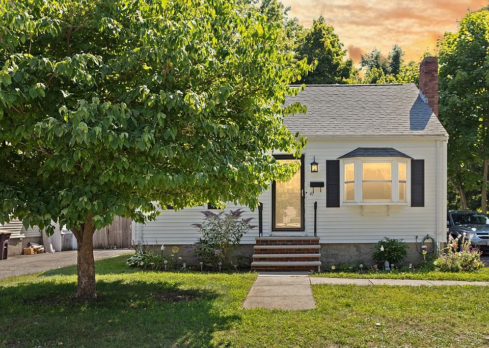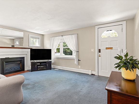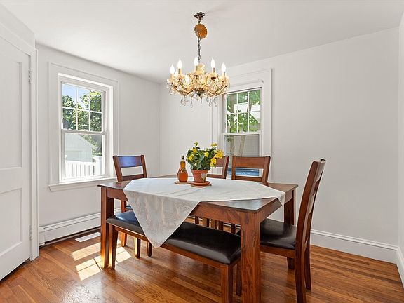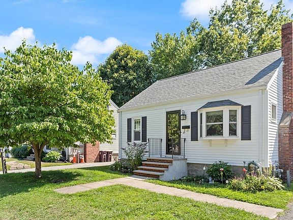 This well loved & thoughtfully maintained cape home is located on a peaceful side street & ready for its new owners. Step inside the light filled, carpeted living room featuring a timeless fireplace, complete w a mantel. Off the living room is a sizable bedroom with gleaming hardwood floors. Just down the hall is a private dining room with matching flooring & overhead lighting from the hanging chandelier. Also on this level is a fully renovated bathroom, just waiting for your personal decor! The kitchen offers space for either a small table, or butcher block as well as access to the back deck. Upstairs you'll find 2 additional carpeted bedrooms both with access to the eaves for storage. The basement includes interior & bulkhead access, all of the utilities as well as laundry & a drop sink for convenience. There is also a finished 10x18 room ready to be used to fit your needs. With central air, and efficient gas heath, this home is sure to provide comfort among the charming details!