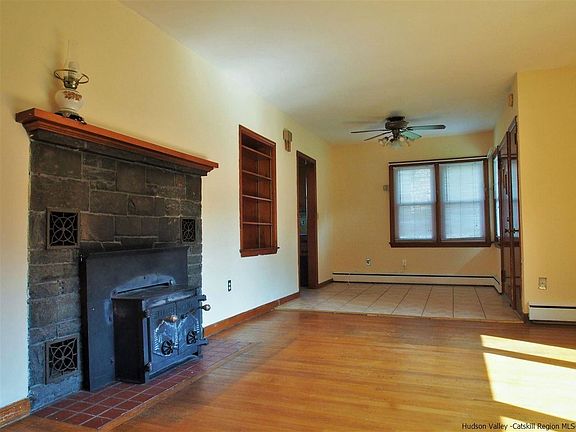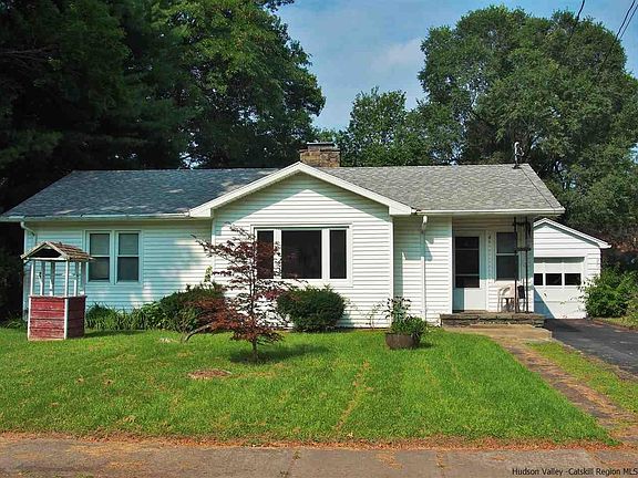 Affordable mid-century Ranch, solidly built, 2 Bedroom, 1 Bath Ranch, in the heart of Ellenville Village. Hardwood floors throughout, ceramic tile in kitchen, bathroom and foyer. Wood trim and wood doors, replacement windows throughout. Full basement with lots of storage cabinets, and one room semi finished. Stone Fireplace with wood-stove insert, Large Picture window in roomy living room. Covered stone patio to the rear off Kitchen with lots of space for furniture, grill and lazy hammock. Spacious yard with lawn and trees offer semi privacy in a village setting. One car detached garage with added workshop, shed to the rear. Property is easy to show. Ellenville is approx. 90 miles northwest of New York City and 90 miles southwest of Albany, NY. Located at the eastern base of the Catskill Mountains, and the western base of the Shawangunk Ridge. Ellenville is within the Hudson River Valley National Heritage Area.