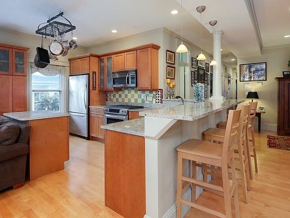 Immaculate 3 bedroom unit on the water in South Boston! This sun-filled home offers an open floor plan, spacious dining area, living room with fireplace, and a renovated kitchen with breakfast bar. Custom cabinets, granite countertops, and hardwood floors throughout. This space is wide open and perfect for entertaining. Comes equipped with two private decks - and also an enormous common roof deck with spectacular water views. Washer/dryer in-unit, and additional storage is conveniently located in the basement. This property is a must see! Take a look at the Virtual Tour.