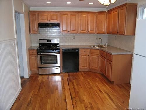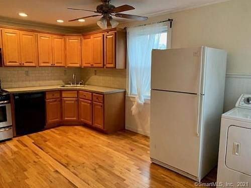 Beautifully remodeled two-bedroom townhouse-style duplex on lovely level lot in convenient Fairfield Woods location (apartment located in back of house. Striking new maple eat-in-kitchen has attractive countertops, subway tile backsplash, ceiling fan, updated appliances, wainscoting, pantry, and hardwood floors. Living room with hardwood floors, two bedrooms with neutral berber carpeting & double closets, stylish ceramic tile bathroom, 1st floor laundry with washer & dryer. Thermo-pane windows, gas heat, and a large level backyard adds to appeal. Lawn maintenance is included in rent. Parking on street. Owner is looking for good credit and references. Please - no smoking or pets in unit. Move-in condition and ready for immediate occupancy. Listing agent related to owner. PLEASE Do not park in the driveway when showing home (belongs to the apartment in front.