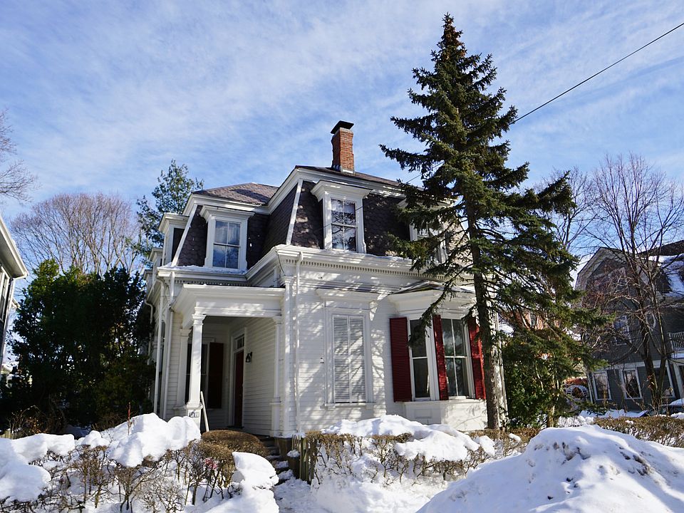 This gracious 1870 mansard Victorian, located in the heart of the historic Half Crown-Marsh District of Cambridge, awaits your restorative touch. The property has period features, 10 and 11-foot ceilings, and a full basement. The 30-foot living room is accented with ceiling medallions, two chandeliers, and a wood-burning fireplace with glazed tile and carved wood mantle; the southwestern corner exposure ensures light pours in through the original 7 x 3 windows. The dining room has a deep hutch, and the eat-in kitchen has two pantries. A half bathroom and access to the side yard complete the first floor. Taking advantage of the mansard style, the high ceilings continue throughout the second floor where there are four-plus bedrooms, a full bathroom, and two linen closets. The clapboard exterior has wood shutters and a slate roof. The property is just one block from the Charles River and half a mile to Harvard Square.