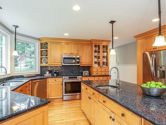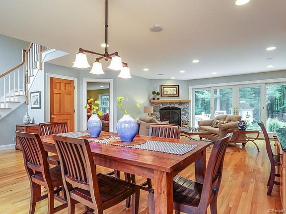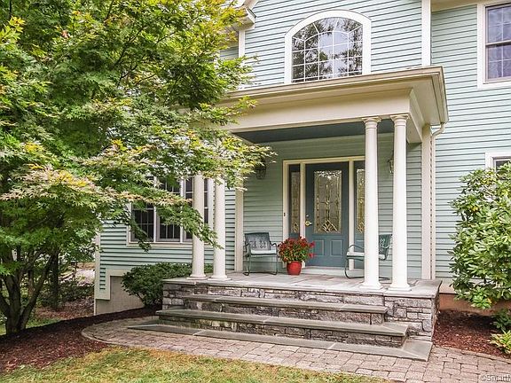An EXTRAORDINARY, often -admired home in one of the prettiest settings in Glastonbury ~ Nestled on a lovely, level 1.2 acre lot, this fantastic transitional Colonial boasts a design that is both unique and captivating, with a wide open layout surrounded by windows inviting the outdoors in. Pretty Kitchen with custom cabinets, sparkling granite center island and walls of windows flows directly into Great Room, so that the chef is always part of the party Enjoy a stone fireplace, stunning Dining area, cozy Family Room with French doors to Office/ Den with marble surround fireplace, and a mudroom area with powder room with laundry. Upstairs is a Master suite with walk in closet and fabulous remodeled Master bath, featuring luxurious new tile shower with glass enclosure, and two additional bedrooms with full bath. An unfinished attic offers intriguing expansion possibilities In the walkout lower level there is MORE living space, with a finished recreation area, office, and full bath Additional highlights: hardwood flooring, central air with 2 new compressors, central vac, propane heat, and an IMMACULATE 2-bay attached garage with freshly painted walls and floor. Don't miss this GEM