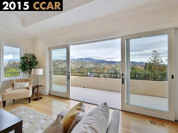Designed by noted architect William Wood, this newer Mediterranean hillside estate was custom built to take advantage of the magnificent views of Mt Diablo and the surrounding hills. Wraparound balconies and walls of windows provide spectacular vistas from the grand size spaces. This five bedroom, four and a half-bath residence is a harmonious blend of entertainment areas and comfortable living spaces. This home is built with the finest quality details including soaring ceilings, custom millwork, Anderson windows, French doors, in addition to the beautiful white oak hardwood and marble floors and marble fireplaces, adding to the overall impressive design. The home encompasses a network of open and flowing rooms and spaces. The main entry level features a striking living room and dining room with crystal chandelier, and a study, all with natural light from the large picture windows framing the gorgeous views. The chef's kitchen is spacious and oriented to make the most of the gorgeous vistas. It features a custom distressed cabinets, granite center island and work areas with dual sinks and dishwashers. The Thermador stainless steel appliances feature a 6 burner gas range with griddle and food warmers, double ovens and microwave. A large family room adjoins the kitchen with a marble fireplace and impressive wet bar with built in cabinetry, and wine cooler, under cabinet refrigerator and large sink. Additional rooms on this level include a half bath, a guest bedroom with en-suite bath and separate entrance, laundry and 3 car garage with extra high ceilings. The upper level features a spacious master retreat with marble fireplace, large walk-in closet, and enclosed private balcony. The luxurious bathroom features dual sinks, Travertine tiled bath and floors, separate shower and Kohler deep-jetted tub for relaxation. The lower level is ideally situated for comfortable family living with three bedrooms and two baths, a flexible bonus room; and wine cellar. One bedroom features an en-suite bath and the additional two bedrooms share a Jack and Jill bath with double sinks, marble counters, floors and separate area with tub and shower for privacy. The exceptional backyard provides endless entertainment opportunities. Every area has been thoughtfully created to include dedicated spaces for entertaining and play. Features include a fire pit, spa, a sparkling pool with solar, built-in BBQ and 600 sq ft cabana with kitchen, full bath an
