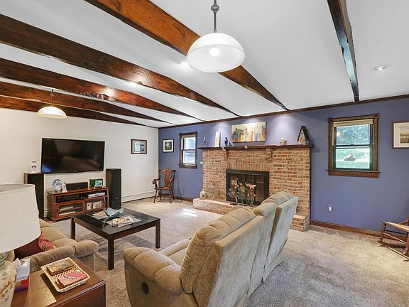 - RoomLivingRoomFeatures: Sunken, Fireplace - Woodburning, Floor - W/W Carpet, Ceilings - Beamed