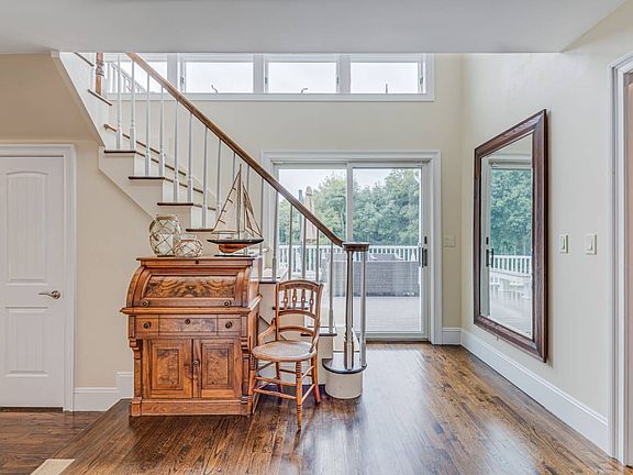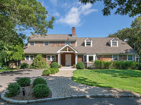 On a quiet road south of the highway in Southampton, this 4,200+/- sq. ft. home on 1.29 acres with four bedrooms and five baths is a great place to relax or entertain, with decks on two levels and a 40' heated pool. Enter to bright living areas flowing among a living room with wood flooring, dining room with stone floor, fireplace, eat-in kitchen with stone flooring, island seating, stainless steel appliances, and glass doors to an expansive deck for outdoor dining and seating. A guest bedroom suite and an additional full bath are also on this level. Upstairs find the master suite with deck and bath with granite-top vanity and glass shower. Two additional bedrooms sharing another bath are also on the second floor, along with a den/office. The lower level is finished as recreational space and includes a temperature controlled wine cellar. Located minutes to Southampton Village, ocean and bay beaches.