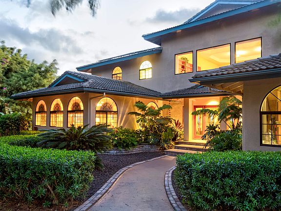 Enter a world of beauty through your PRIVATE entry gate to a gorgeous 4,232 sf home with UNOBSTRUCTED VIEWS on 2.2 acres in Pau Hana Estates! The huge windows showcase the bi-coastal ocean views and glorious nighttime city light views! This beautiful 4 BR, 3 BA home features a custom kitchen with a panoramic view window looking out to the private backyard and amazing flowers, shower trees, fruits for the picking and mature palms. Just stand at the induction cook top and watch the cruise ships pull in and out of the harbor! This elegant property comes with a fully owned PHOTOVOLTAIC system as well as solar hot water! The breezes are lovely at the home's 1500' elevation; rarely is heating or air conditioning required. You will also appreciate the Agricultural zoning, the low property taxes and very close proximity to town. This usable parcel is large enough to keep horses or livestock and you can grow edible gardens in the raised masonry vegetable beds. This home has been lovingly cared for over the years and reflects the heart and soul of the Owner. There is beauty everywhere you look. Why not capture the elegance for yourself?