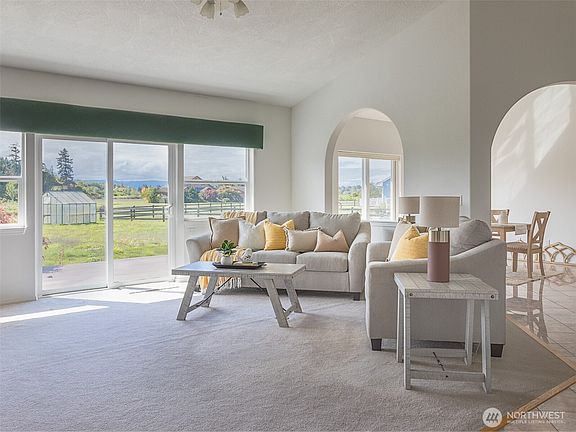 Stunning custom home on 1 acre in Sequim's sought-after Blue Hole. Enjoy panoramic mountain views, vaulted ceilings, large rooms and graceful arched openings that add interest to this smart split floor plan. Functional, elegant, and great for entertaining. Enjoy a propane fireplace on chilly days, a formal dining room with marble floors, plus a cozy eat-in kitchen area with bay window. Spacious primary suite features dual walk-in closets and a spa-like bath with dual sinks, jetted tub and separate shower. South-facing deck offers year-round outdoor living, plus a greenhouse in the manicured yard for gardening. Large 3 car garage and premium water filtration system. Loads of storage throughout!