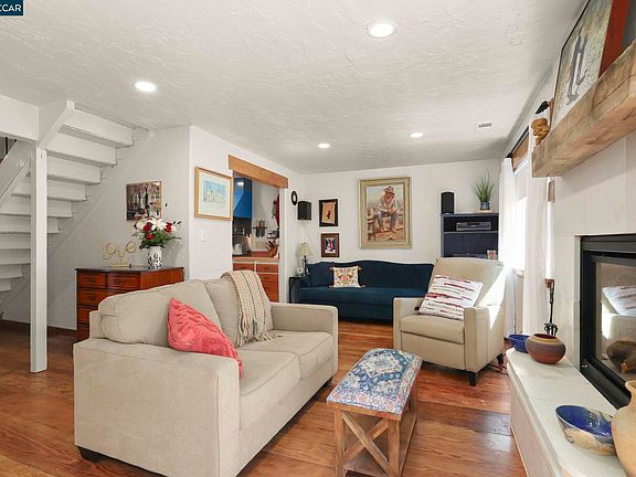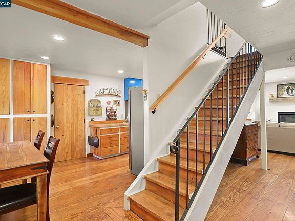 Santa Fe Inspired Custom Craftmanship abounds throughout this delightful home featuring "Douglas Fir" wide plank distressed flooring, hand crafted doors, cabinet doors, drawer fronts, window trim & hand troweled custom textured walls. Downstairs bedroom or den. Half bath offers custom built-in vanity & vessel sink. Combined dining and living area offers a slider to patio, recessed lighting & cozy gas fireplace w/ limestone floor to ceiling surround, raised hearth & rustic mantle. Large eat-in kitchen offers butcher block counters with deep double stainless steel sink with insta-hot water dispenser, recessed LED lighting, custom built commercial "Blue Star" 6 burner gas range & oven w/ matching vent hood, pot filler, & sunny dining nook w/ built-in pantry cabinets for extra storage. Pentair water filtration system piped to kitchen sink, pot filler & refrigerator. Spacious primary suite offers Mt Diablo views & semi vaulted ceiling, recessed lighting, ceiling fan & fireplace. En-suite bath includes built-in vanity with storage & vessel sink & walk-in shower. Updated hall bath offers oversized soaking tub. Custom built-in outdoor dining area w/ limestone fire table is the focal point of the pvt patio designed for easy entertaining. Marsh Creek Villas HOA offers pool & club house.