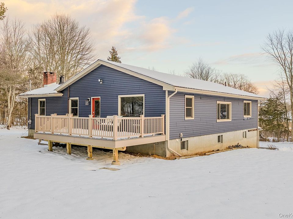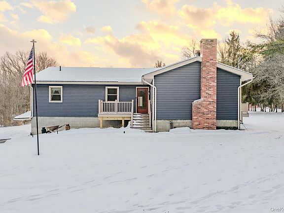 Exposed beams throughout establish a striking country chic and rustic style, carrying warmth and character from each space into the next. The kitchen showcases pristine solid oak cabinetry with abundant storage space and generous attention to detail. Every corner of the residence reflects true craftsmanship and care of the entire home, from meticulously kept finishes to thoughtful upgrades that create simple and confident ownership. Replacement windows provide large oversized scenic glass to enjoy the view and highlight the surrounding acreage with exceptional clarity while echoing the refined details found throughout the house. The spacious rear deck, beautifully remodeled, overlooks the vast backyard, inviting the next owner to imagine creating an oasis of their own design with gardens and outdoor lounges beneath the open Ulster sky. The remodeled front deck at the entrance welcomes guests through a new door with warmth and style and offers a delightful place for morning coffee and evening conversation.