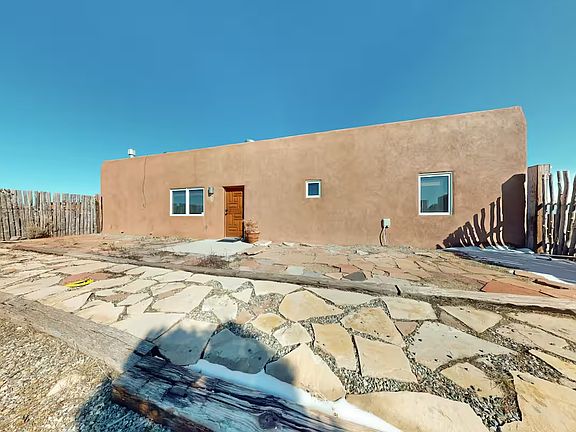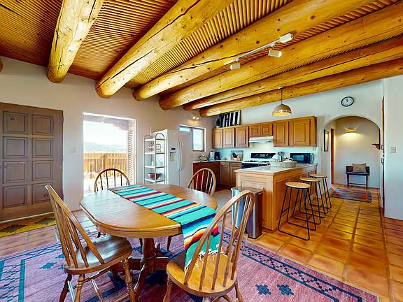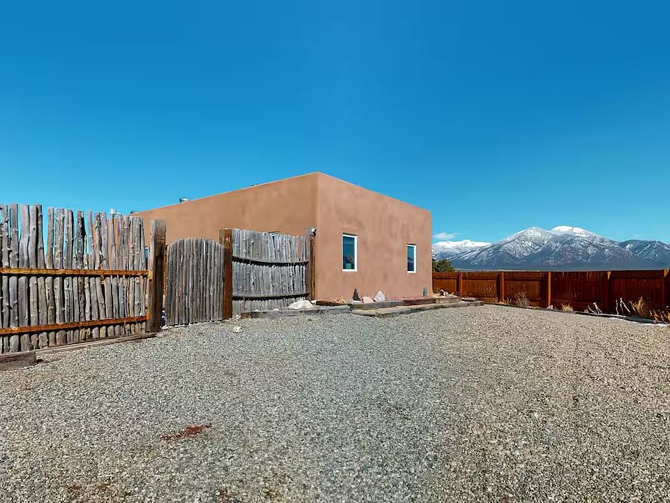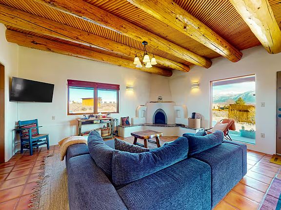 Beautiful southwestern style home fully furnished set on two acres in Lower Colonias offers sweeping views of the Sangre de Cristo range. Open floor plan, large windows, kiva fireplace, two spacious bedrooms, office with French doors, two full bathrooms, and utility room. Radiant heat warms the tile floors while stunning vigas ceilings enhance the southwestern feel. Cozy up near the large kiva fireplace with built-in Bancos, or spend time cooking in the kitchen designed with ample cabinetry and counter space. The primary suite includes a private bath and the second bedroom sits next to an additional full bathroom. Located close to town and Taos Ski Valley. Open to rent length. Can be as little as 6 months or as long as 12 months. Renter is responsible for utilities.