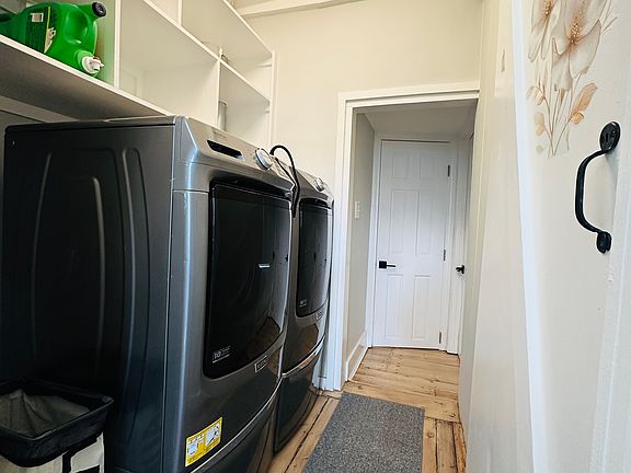 - Laundry room offers Maytag commercial washer and dryer with storage drawer footers and plenty of shelfing storages.