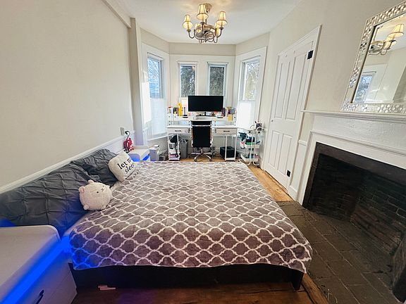 - Master bedroom features 4 bay windows, a full-size bed, a 63" desk, and a ceiling fan light.