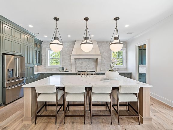 For those dreaming of a beach house beyond the ordinary, take a look at this brand-new, one-of-a-kind custom beauty. Complete with designer wallpaper, feature lighting, handpicked artwork and high-end furnishings by local designer, Apres Sun, it's quite unlike anything else on the market. Every space has been thoughtfully honed to combine European aesthetics with practical functionality. Rising from street level, this three-story home is fronted by a wide paved driveway and lawns edged with color-filled flower beds. A two-car garage accommodates vehicles, bikes and beach toys, while a covered porch frames the grand entrance. Explore the spacious pool room with sitting area, the laundry, bunk room and the pool bathroom on this level. On the second floor, wood flooring perfectly contrasts the light stone archway, which separates the dining area and the comfortable sitting room from the chef's kitchen. Imagine entertaining and memory-making with family and friends in this attractive space. A kitchen island provides seating for snacks and everyday mealtimes. White-washed walls, stainless steel appliances and veined quartz countertops enhance every inch of this enviable chef's domain. A butler's pantry and a custom hood over the range are just some of the added delights. A half bathroom and the first of two master suites complete this level. You'll want to check out the spacious walk-in closet and the stunning master bathroom with custom tile.