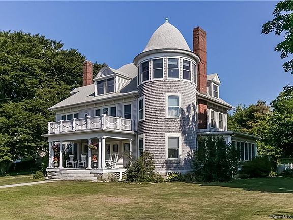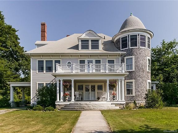 Completely renovated in 2003 while retaining the charm and historic feel of the era in which it was built. Impeccable taste radiates throughout. Enter through the original front door with historic window treatments to a grand foyer. To the east side of the house there is a formal Living room with a gas fireplace, pass through original pocket doors into the formal Dining room with a second gas fireplace and built-ins, step into the side Sun room surrounded by a wall of windows to embrace the morning sun. To the west side of the house there is a second family room with a third fireplace, a study or office. The north end of the house boasts the stunning designer Kitchen complete with a large granite Island and gas cook top, a casual dining area with a beautiful brick fireplace to warm the room. There is an additional back stairway that leads up to the second floor. Enter into a true Master Suite with a full sitting room, tin ceilings and a full bath. There are two more bedrooms each with a full bath. Walk out onto a beautiful upper level Balcony to enjoy the breeze and the evening sunsets or if preferred enjoy the upper rear balcony for a quiet and peaceful setting. The third floor offers over 1000 additional sq ft with 2 bedrooms, a full bath, a Den with sweeping Water Views of the LI Sound & the Thames River. Stroll to the Beach, Golf or marinas. Amenities include Central Air, security, fenced yard and a carport. One of Eastern Points finest architecturally designed homes