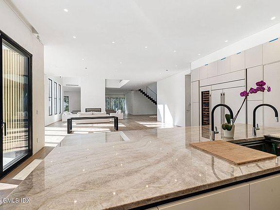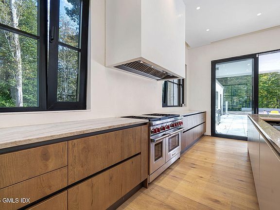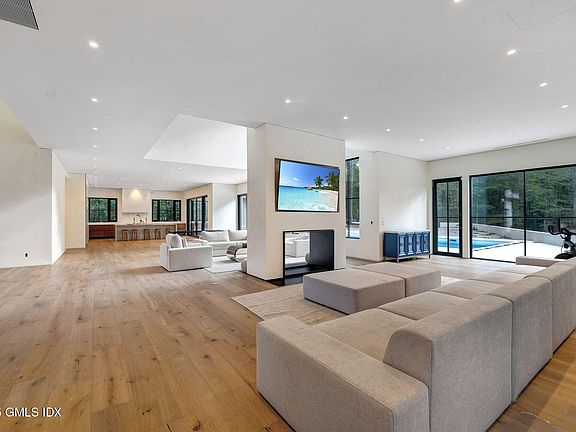 Set on 4 acres of gated, private, west-facing land in the heart of Backcountry Greenwich, this 10,000+ sq ft modern masterpiece is a triumph of minimalist design and exceptional craftsmanship. Conceived by a bespoke local builder in collaboration with renowned Vakota Architecture, the 6 bedroom, 9.1 bath residence blends timeless architecture with the finest European design elements. A grand entrance with soaring 40+ foot ceilings and a floating architectural steel staircase sets the tone for what lies within. Expansive 10' French oak floors and natural Italian lime plaster walls create a serene, organic palette, while oversized windows frame the surrounding natural beauty-blurring the line between indoors and out. The custom Italian kitchen by Bellavista Collection features Taj Mahal countertops, an 11+ foot island, and a hidden scullery/pantry, offering both elegance and function. Flowing, open-concept living spaces are anchored by walls of glass that bathe the home in natural light and lead out to a resort-like backyard with pool and multiple entertaining areas. The luxurious primary suite offers a private terrace with sunset views, a spa-inspired bath, fireplace, and custom walk-in closets. With 11+ foot ceilings on the first floor, 10' ceilings upstairs, and linear diffusers integrated throughout, every detail has been considered to achieve a flawless balance of sophistication and comfort.