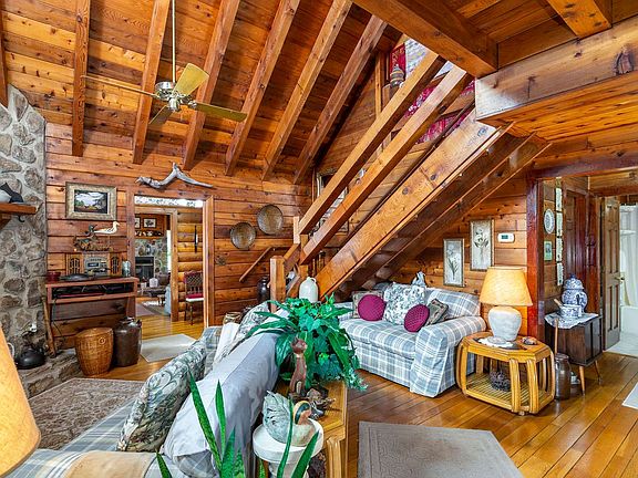 True log home in sought after Mountain Tops Community; as close to the charming town of Blue Ridge as you can be! Sits on beautiful, level corner lot right when you enter the community; as quick & convenient as can be! True log construction, cathedral ceilings in great room, hdwd floors, screen porch, lots of wrap around decking. 2 main level guest beds/1 bath. 1 upper level bed/1 bath. Living room w/ fireplace is open to kitchen/dining room. Big bonus room on main level features another fireplace & currently used as bedroom; perfect for home office or 2nd den. Beautiful stone hardscaping on property for outdoor enjoyment. Garden spots throughout. HOME NEEDS EXTENSIVE EXTERIOR work but SO much opportunity here; renovate & gain instant equity. No better location for full time Blue Ridge living. Enjoy protective covenants of Mtn Tops but NO HOA fee! Appointment only AFTER 2PM please. Buyer must agree to 60 - 90 day temporary occupancy agreement. Extensive deck, door window repair/replacement needed.