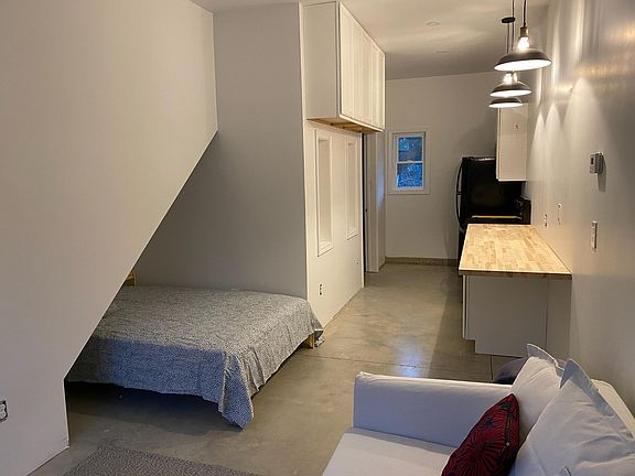 Brand new, super sleek, furnished Efficiency for rent. Only 300 square feet, this unit is most appropriate for renters without a lot of belongings. 1st level unit, radiant heated concrete floors. Unit has a double bed, couch, Wall mounted TV, full kitchen with stove/oven and full size fridge, bathroom with standing/stall shower. Located 15 minute drive from Camden or Belfast Maine, about 1/2 mile from Searsmont center, Fraternity village, and Threshers tasting room. Beautiful walkable rural road. Great part time living or remote work space! Owner pays for: plowing, trash removal, wifi, electricity, propane heat. Month to month lease, but at least 30 days notice to terminate month to month must be given. Absolutely no pets and no smoking. Off-street parking.