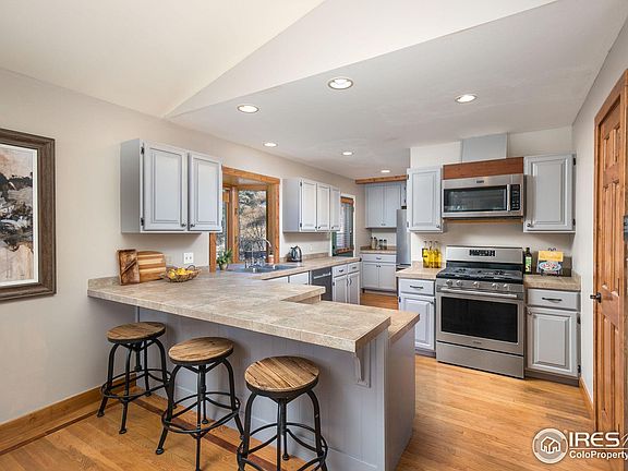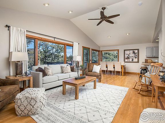 Nestled on a gently-sloping and completely-usable lot up mellow, well-maintained roads in the Goldilocks location of Pinewood Springs, this quiet, beautifully-appointed home provides modern amenities, light-filled, open-concept living, beautiful views & the quintessential mountain experience without sacrificing convenience. Just around 10min. to Lyons, with its unique shops, galleries, fantastic dining & drinking options, entertainment & outdoor recreation (on rivers, trails and mountains)! Just 15-20min. up the hill are Estes Park and all of the activities available in Rocky Mountain National Park. Plus, it's just 30min. to Longmont or Boulder, so you don't have to sacrifice convenience. The Little Thompson River meanders through the community which also has its own private swimming hole ("The Tubs") and picnic area, as well as the Crescent Lake fishing pond which is all managed by a voluntary property owner's association. There's no "HOA." The property offers multiple outdoor spaces and a large, fenced-in backyard with lovey rock formations, extensive landscaping, a seasonal casita (perfect for a studio, workshop, or office), and RV Parking. The paved driveway is easy to maintain with full southern exposure. On the main floor, tucked away from the great room, you'll find a private Primary retreat that looks out to the fenced-in aspen garden filled with perennials and bulbs providing 3-season blooms. The great room offers beautiful views and length of vision as well as access to two different decks that provide exceptional outdoor living. Downstairs you'll find a large den with access to the rear patio area and both other bedrooms. The home also offers the additional comforts of a whole house UV water purification system, as well as a whole-house backup generator. With its convenient location, modern comforts, access to unparalleled natural beauty and outdoor recreation, this home is an ideal retreat for those seeking a balance between serenity and convenience.