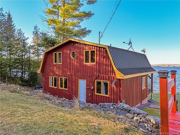 Dream retirement home on sporting lake. This 4-season home sits on 4.2 acres and is accessed by a private drive. The home faces 124 feet of waterfront access and has a long dock that allow you to park your boat out front. There is a rock beach, fire pit and a large area for outdoor entertaining. The home sits on a concrete slab, is two stories and features 2 large covered balconies on the main and second floor as well as a deck on the back side. The grounds have been cleared and landscaped with rock walls and have ample parking and room for growth for family retreats. Hardwood floors throughout and wood beams give a Nordic feel, the main level features a kitchen, bathroom wet bar and living and dining area. The focal point is an Osborne woodstove with gold accents. The second level has 3 bedrooms and an open sitting-living area with balcony access. The house is wired with a separate panel for a generator, and has a storage shed. There are trails for hiking, in summer and snowmobiling in winter. The lake is great for fishing in summer and winter. This location is private only an hour from Fredericton, and a quick 13 kms to the Maine border. Come fall in love with this view.