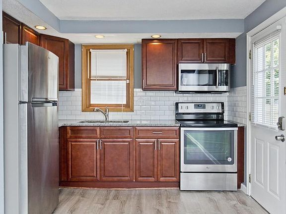 Three bedroom, corner lot Cape with two car garage. Granite kitchen counter tops with subway tile back splash, stainless stove and microwave, and refrigerator. Two connected first floor living areas. Partially finished basement with three rooms plus laundry room. Good yard space. Only a two minute drive to Western New England University and a six minute drive to Springfield College. First, last, and security due at lease signing. Tenant pays gas and electric. Landlord pays for water/sewer, city trash removal, and snow removal. Landlord maintains lawn. Fence in photos has been removed. Stainless refrigerator in photos has been replaced with white refrigerator.