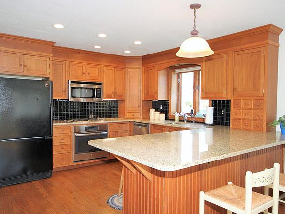 Waterfront!! You will fall in love with this delightfully spacious, open and bright 2 bedroom, 2 Bath Cape overlooking John's Pond. Enjoy indoor and outdoor views of nature with a generous deck and newly screened in porch. Views from almost every room Beautiful Vermont Crown Point custom wood Kitchen with gas cooking, stainless appliances and dining area open to living room with cathedral ceiling and wood fireplace, all with hardwood floors. Newer den addition has oak flooring with beamed ceiling, skylights and Jotul gas fired stove, All Anderson Windows, convenient first floor laundry, Master Suite has sitting area and private bath. Finished room in basement perfect for hobbies. Covered front porch welcomes you to and from attached one car garage. Don't wait!! John's Pond Estates annual fee is only $125. and includes maintenance and insurance for 3 beaches, boat ramp and common areas.