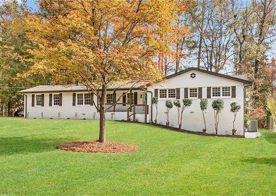 Gorgeous oversized ranch nestled on a lush corner lot in fantastic East Cobb location in East Valley Estates neighborhood w/ finished basement! Stunning custom renovation inside & out! Charming curb appeal with front porch, lantern lighting, new shutters, & new upgraded front door! Exterior features dark gutters & downspouts! Totally open concept main w/ gleaming hardwood floors, shiplap walls, & all new lighting throughout. Beautiful new kitchen has white shaker cabinets, SS appliances, quartz countertops, floating shelves, ceramic farm sink & subway tiled backsplash! Oversized kitchen island has more storage & bar seating! Bourbon bar w/ floating shelves can hold your spirits & liquor display with dual pantries on either side! Large glass enclosed sunroom is perfect for entertaining & has exterior access to back deck w/ stairs to the level/low maintenance backyard! Near the front door there is room for a formal living area located next to the open dining room w/ view of kitchen! Another large open living room is perfect for gathering w/ a cozy brick fireplace & wall to wall windows w/ tons of natural light to enjoy! This room also has exterior entrance to driveway and also another entrance to back deck, backyard, & sunroom! Head down the hall to find the master suite complete w/ a walk-in closet & gorgeous master bathroom w/ walk-in shower & vanity w/ quartz countertops. Second bedroom is an on-suite w/ its own private full bathroom! Third bedroom has access to full hall bathroom that can also serve guests! Located in the finished basement is a separate laundry room, a fourth bedroom, a fourth full bathroom, and another living room w/ exterior access that could serve as a game room, home office, or playroom - the options are endless! Home has a new water heater, new AC unit, & new furnace!